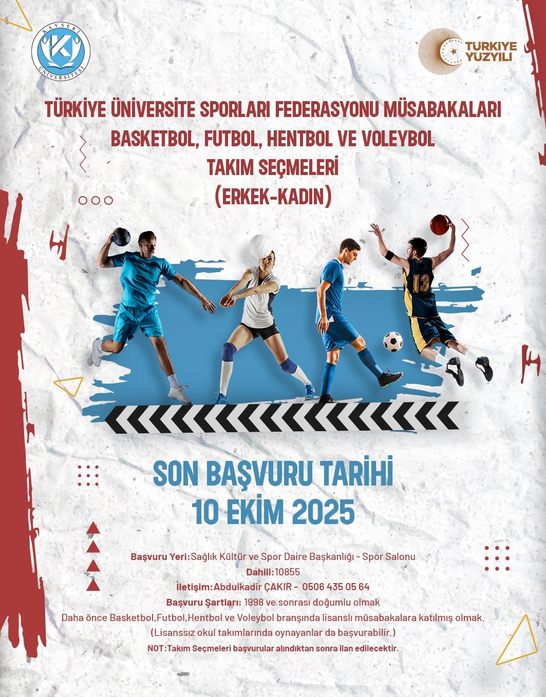 Those wishing to form men's and women's teams to represent our University in interuniversity competitions in basketball, football, handball, and volleyball, which are included in the 2025-2026 activity program of the Turkish University Sports Federation, must apply through the Department of Health, Culture, and Sports by October 10, 2025.