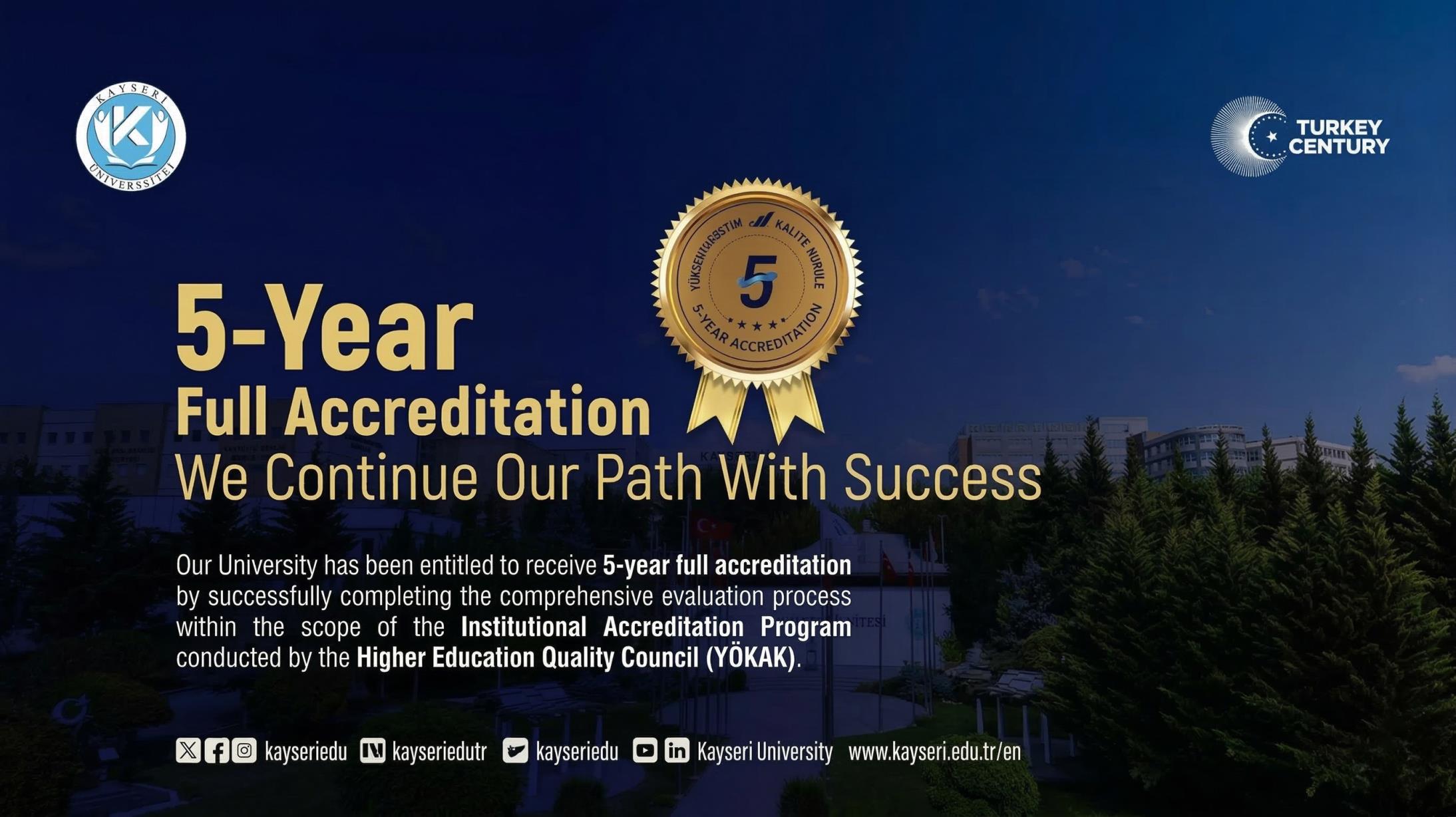 Kayseri University (KAYÜ) has been awarded 5 years of Full Accreditation within the scope of the Institutional Accreditation Program (KAP), which is carried out in higher education institutions by the Higher Education Quality Council (YÖKAK) with the aim of raising the quality, ensuring sustainability in the field of quality assurance, and increasing international competitiveness.