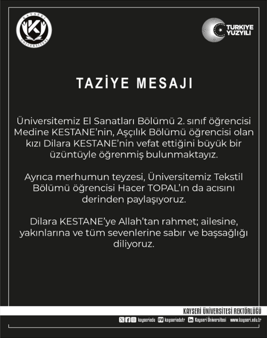 Mustafa Çıkrıkçıoğlu Meslek Yüksekokulu El Sanatları Bölümü öğrencisi Medine KESTANE’nin, Aşçılık Programı öğrencisi olan kızı Dilara KESTANE’nin vefat ettiğini büyük bir üzüntüyle öğrenmiş bulunmaktayız.